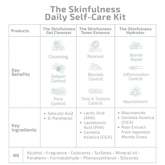 The Skinfulness cleanser, toner essence, and hydrator are gentle yet effective companions for acne-prone skin. Over time, they nurture your skin barrier, helping it become more resilient and less sensitive to acne-causing factors like hormonal changes, diet, stress, UV radiation and all that comes your way on a daily basis.
